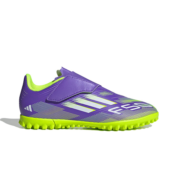 - Tacos de fútbol adidas F50 Club Vel TF para niños, diseñados para canchas de césped artificial corto.